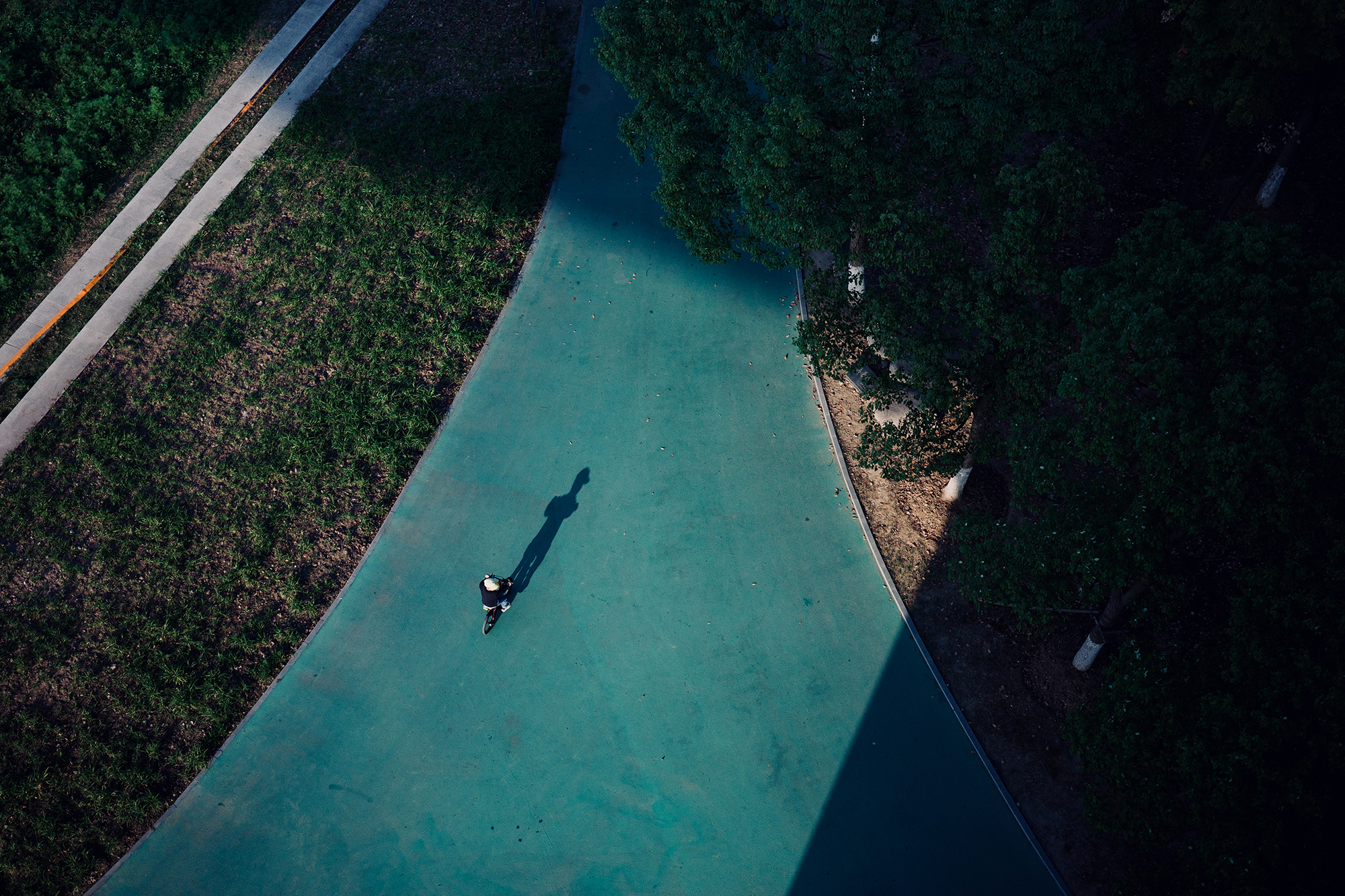 自転車を漕ぐ子供は一見楽しんでいるように見えますが、行く末に日陰があることで、どことなく不穏さを感じさせ、不安な心境のようにも見て取れます。光と影、自然と人工、明るさと暗さ、かっこよさとかわいさ、相反する要素が混在し、想像の余白がある素敵な写真だと思います。 -