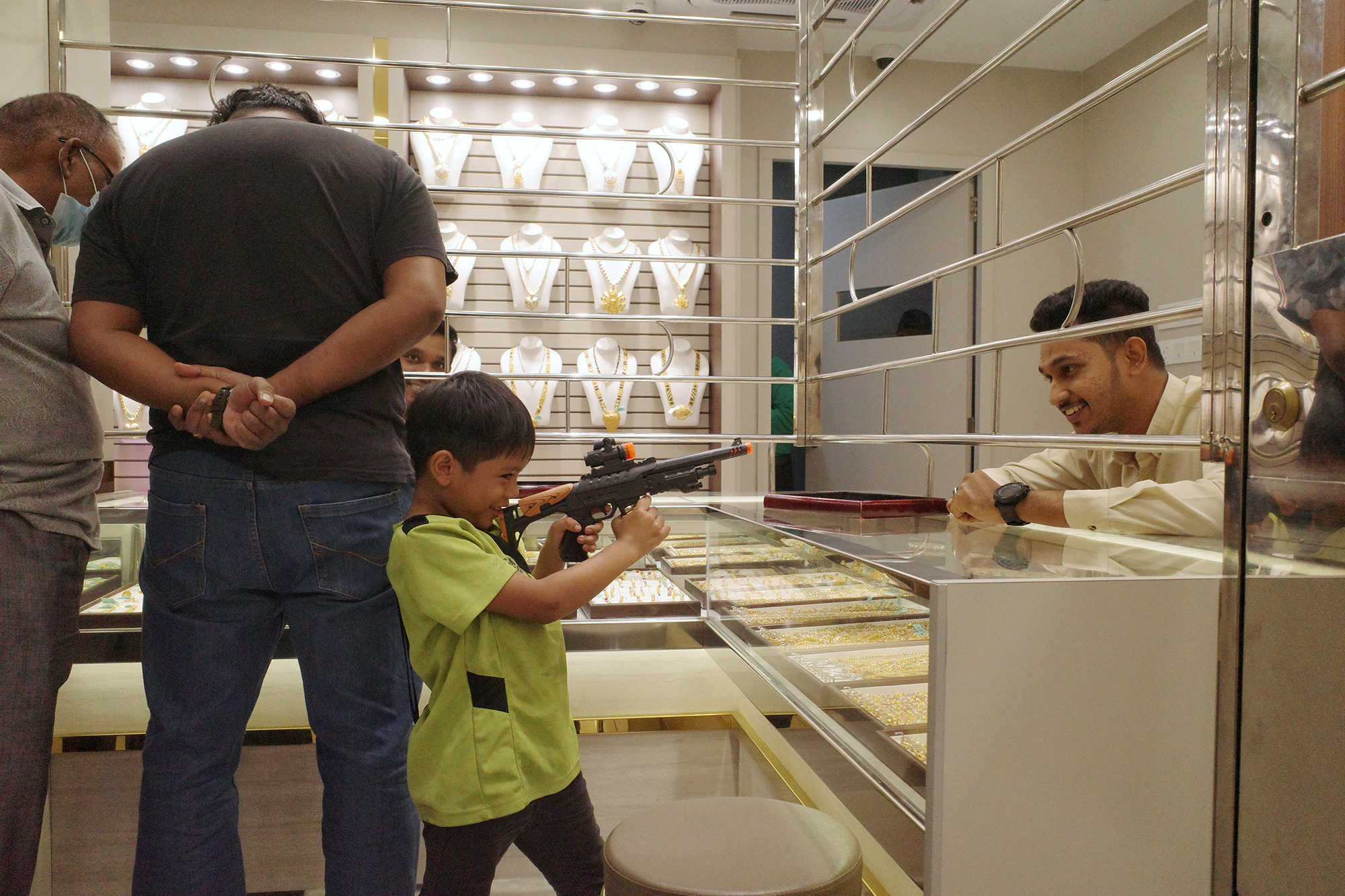 金細工店の売り子と、おもちゃのライフルで武装した少年のやりとりの一瞬をとらえた作品。愛らしくユーモラスな 「強盗シーン 」に思わず笑みがこぼれます。日常ではめったに見られない光景です。 -
