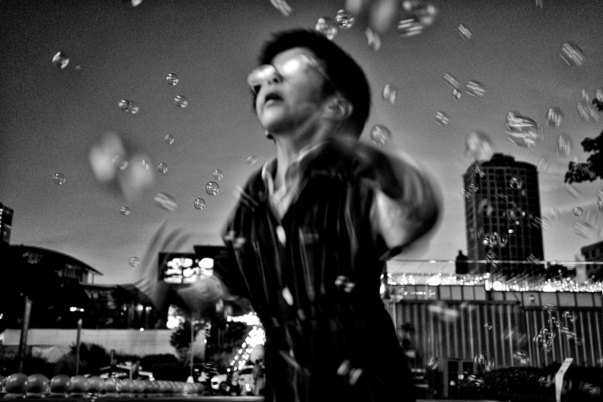 街の喧騒、カラフルなシャボン玉、眼鏡に映る不気味な反射、人生の序列の底辺にいる人物たち、謙虚に生きていても生きづらい......これは現実の荒唐無稽な色彩の光景です。この男性が生み出す視覚的な皮肉は、人々にさまざまなことを考えさせずにはいられません。デフォーカスと粒子の粗さが、写真を具体的なものにも、そうでないものにもしています。生活の中の光景のようでもあり、夢の中の光景のようでも。その光景は芸術的に扱われています。